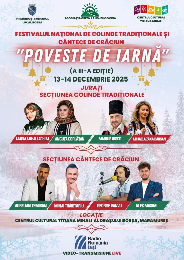 Centrul Cultural „Titiana Mihali” din Borșa, județul Maramureș, va găzdui în zilele de 13 și 14 decembrie 2025 cea de-a III-a ediție a Festivalului Național de Colinde Tradiționale și Cântece de Crăciun „Poveste de Iarnă”, un eveniment organizat de Asociația Culturală Green-Land Bucovina.